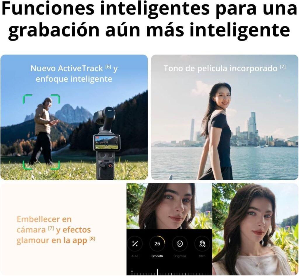 Mientras caminas, corres o incluso vas en bicicleta, los motores sin escobillas del dispositivo compensan el movimiento de inclinación (tilt), rotación (roll) y paneo (pan) en tiempo real. El resultado es un vídeo que parece haber sido grabado flotando sobre raíles. Además, este cabezal motorizado permite funciones inteligentes como el ActiveTrack mejorado, donde seleccionas tu rostro en la pantalla y la cabeza de la cámara gira físicamente para mantenerte en el centro del encuadre en todo momento, sin importar cuánto te muevas. ¡Es como tener a tu propio operador de cámara personal! 🤖🎥