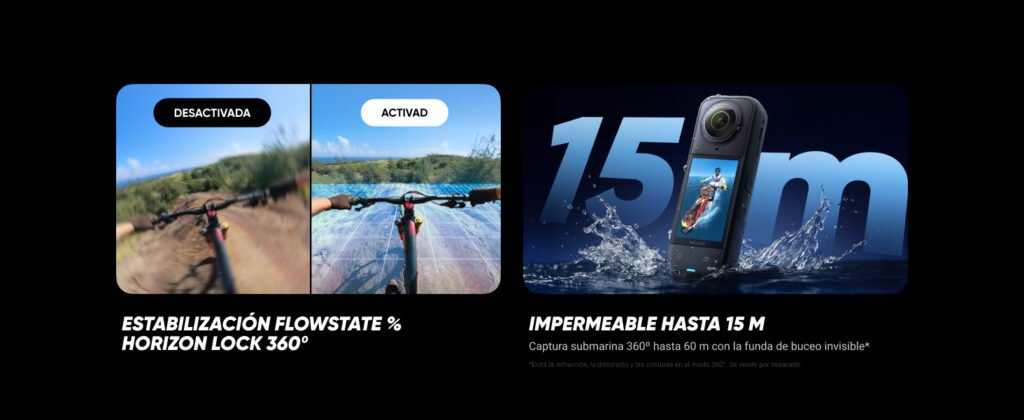 Sumergible hasta 15 metros, la Insta360 X5 es perfecta para deportes acuáticos, grabaciones en nieve o entornos con polvo. Su diseño se ha reforzado para aguantar condiciones adversas, y el sistema de disipación de calor evita sobrecalentamientos, incluso en grabaciones largas.
