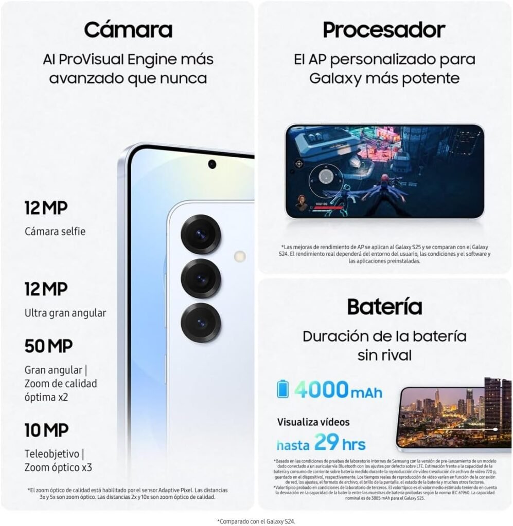 - Diseño: Descubre el Galaxy S25, un diseño elegante con un marco de aluminio duradero, una pantalla inmersiva y una cámar…