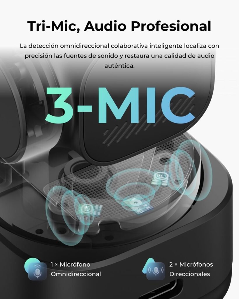 En nuestras auditorías de setups, siempre decimos: «El audio es el 50% del vídeo». OBSBOT ha tomado nota y ha integrado un sistema de Tri-Mic (Arreglo de tres micrófonos) con capacidades de Audio Espacial.